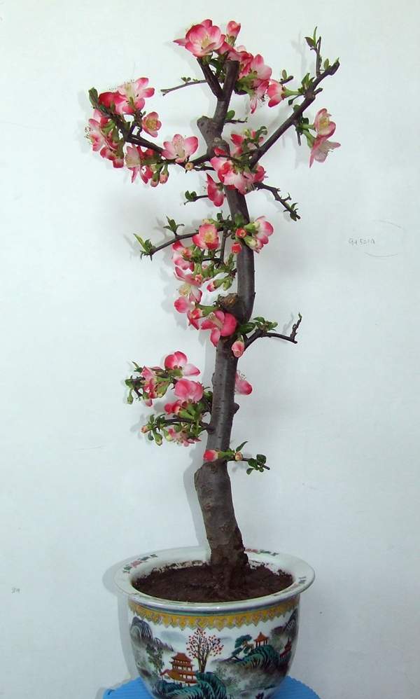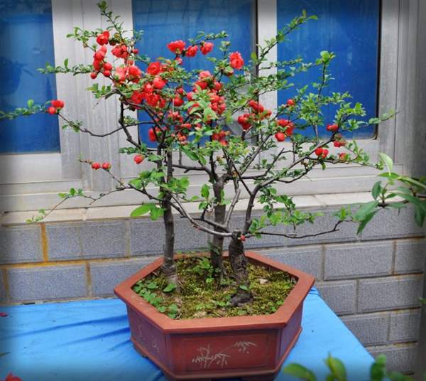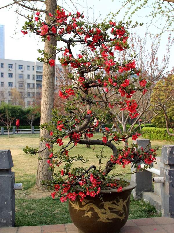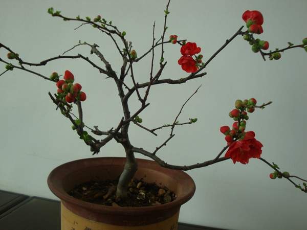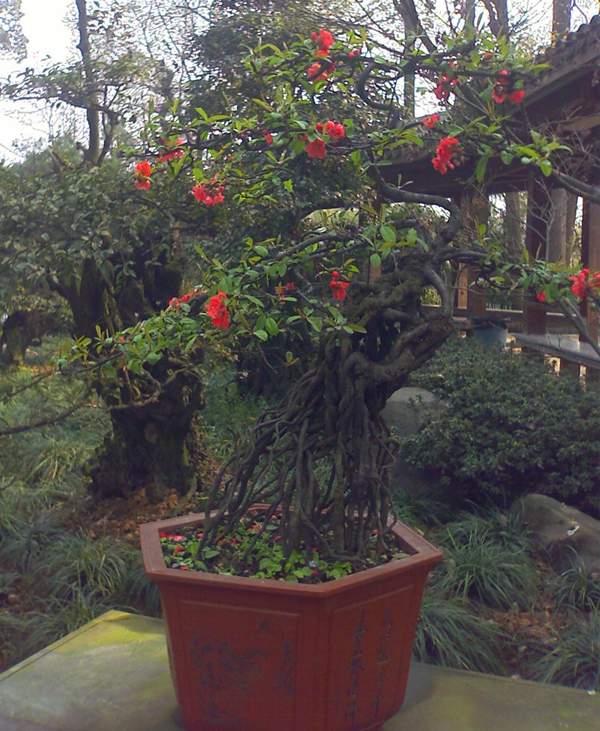 貼梗海棠它又叫作皺皮木瓜,而且還有許多的叫法,是落葉灌木的一種,它在園林綠化上屬于觀花、觀果的優(yōu)良品種;特別是在花期的時(shí)候,滿樹花朵非常的艷麗,顏色多樣;貼梗海棠不但在園林效應(yīng)上有它的風(fēng)采,而且它的果實(shí)還可以吃,果實(shí)營(yíng)養(yǎng)豐富含維生素多,在醫(yī)學(xué)上也有它的獨(dú)特功效;貼梗海棠在綠化上可以栽種在景區(qū)、道路兩邊、庭院等地方;還可以在一些綠化樹中栽種一兩棵貼梗海棠,可以起到點(diǎn)綴的效果,成片的栽種也有不一樣的觀賞效果;它不僅可以地栽也可以制作為盆景,造型多種,常被放置在客廳、花臺(tái)、陽臺(tái)、門庭邊都可以,下面我們就來欣賞一下它的各種造型盆景吧: