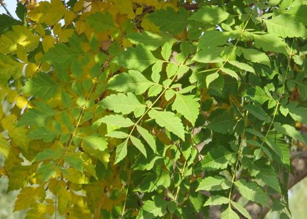復(fù)羽葉欒樹的葉子在它的外緣有細(xì)小的鋸齒,葉子的前端稍尖,橢圓狀;